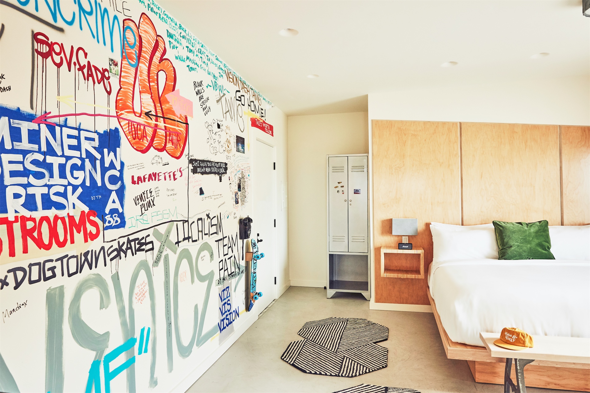 The interiors are shaped by local artists, craftsmen, and designers whose stories are intertwined with the neighborhood. Rooms fall into distinct themes such as Boho, Artist, and Dogtown, each reflecting a different facet of Venice’s identity. Photography documenting local skate culture, custom furnishings, and repurposed skateboard deck details ground the design in authenticity rather than trend. No two rooms are exactly alike.
