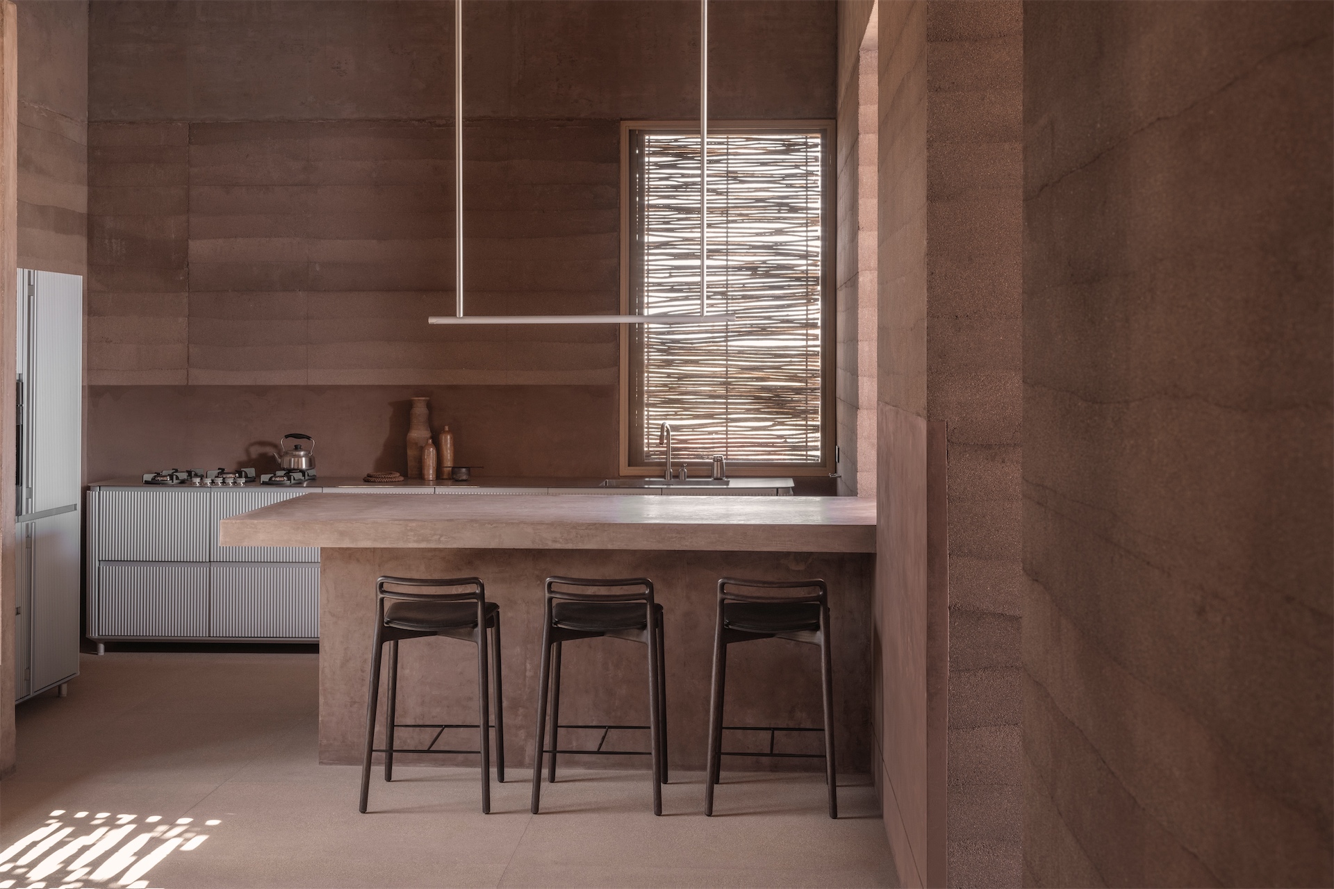 The construction itself is central to the experience. Built using rammed earth sourced from the surrounding area, the thick walls provide natural insulation, keeping interiors cool during the day and warm at night. Left exposed and untreated, the walls define both the exterior and interior atmosphere, giving the house a tactile, elemental presence. Earth, concrete, and wood form a restrained material palette that allows light, texture, and proportion to take precedence.